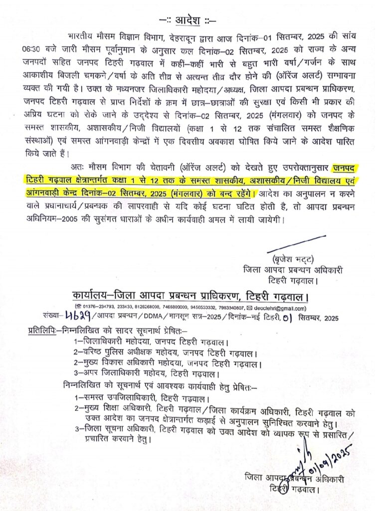 आदेश मे कहा गया है, भारतीय मौसम विज्ञान विभाग, देहरादून द्वारा आज दिनांक 01 सितम्बर, 2025 की सांय 06:30 बजे जारी मौसम पूर्वानुमान के अनुसार कल दिनांक-02 सितम्बर, 2025 को राज्य के अन्य जनपदों सहित जनपद टिहरी गढ़वाल में कहीं-कहीं भारी से बहुत भारी वर्षा/गर्जन के साथ आकाशीय बिजली चमकने / वर्षा के अति तीव्र से अत्यन्त तीव्र दौर होने की (ऑरेंज अलर्ट) सम्भावना व्यक्त की गयी है। उक्त के मध्यनजर जिलाधिकारी महोदया / अध्यक्ष, जिला आपदा प्रबन्धन प्राधिकरण, जनपद टिहरी गढ़वाल से प्राप्त निर्देशों के क्रम में छात्र-छात्राओं की सुरक्षा एवं किसी भी प्रकार की अप्रिय घटना को रोके जाने के उद्देश्य से दिनांक 02 सितम्बर, 2025 (मंगलवार) को जनपद के समस्त शासकीय, अशासकीय / निजी विद्यालयों (कक्षा 1 से 12 तक संचालित समस्त शैक्षणिक संस्थाओं) एवं समस्त आंगनवाड़ी केन्द्रों में एक दिवसीय अवकाश घोषित किये जाने के आदेश पारित किये जाते हैं।