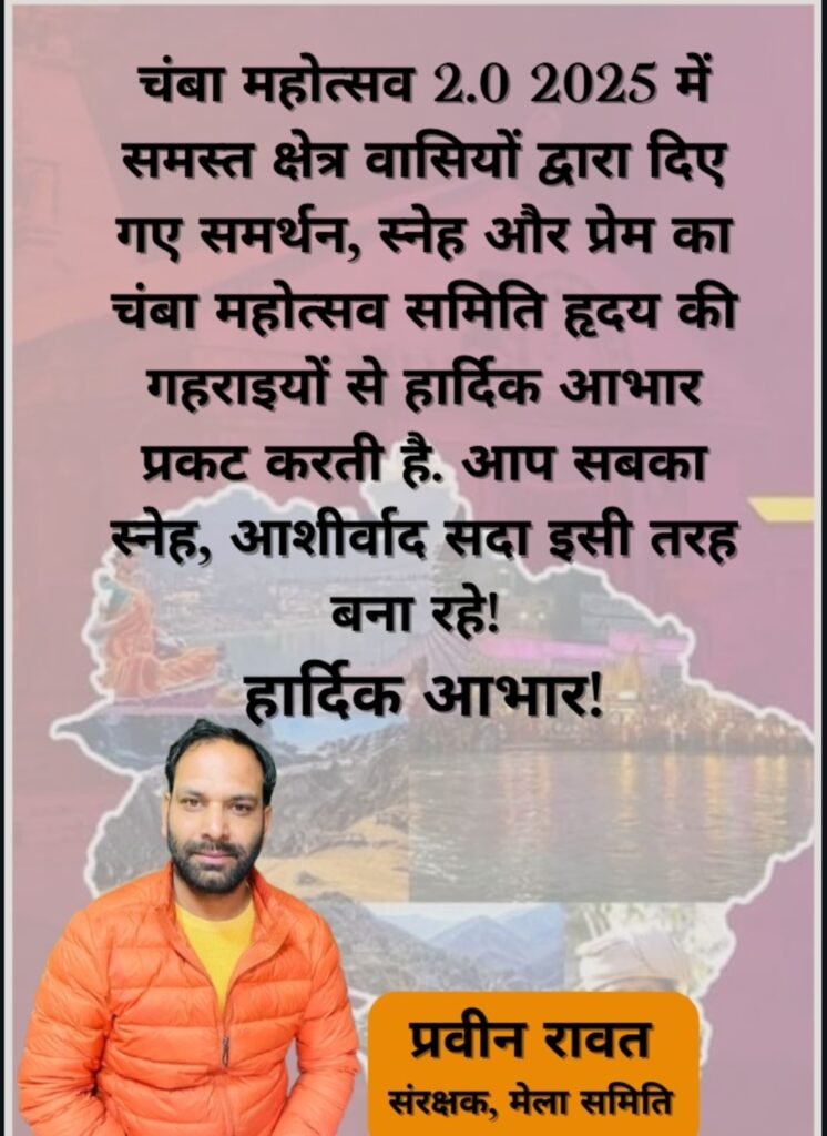 चंबा : चंबा मेला समिति के संरक्षक प्रवीन रावत ने समस्त क्षेत्र वासियों का आभार जताया है. प्रवीन रावत ने कहा कि समस्त क्षेत्र के लोगों के द्वारा दिए गए समर्थन, स्नेह और प्रेम का चंबा महोत्सव समिति हृदय की गहराइयों से हार्दिक आभार प्रकट करती है. आप सबका स्नेह, आशीर्वाद सदा इसी तरह बना रहे.